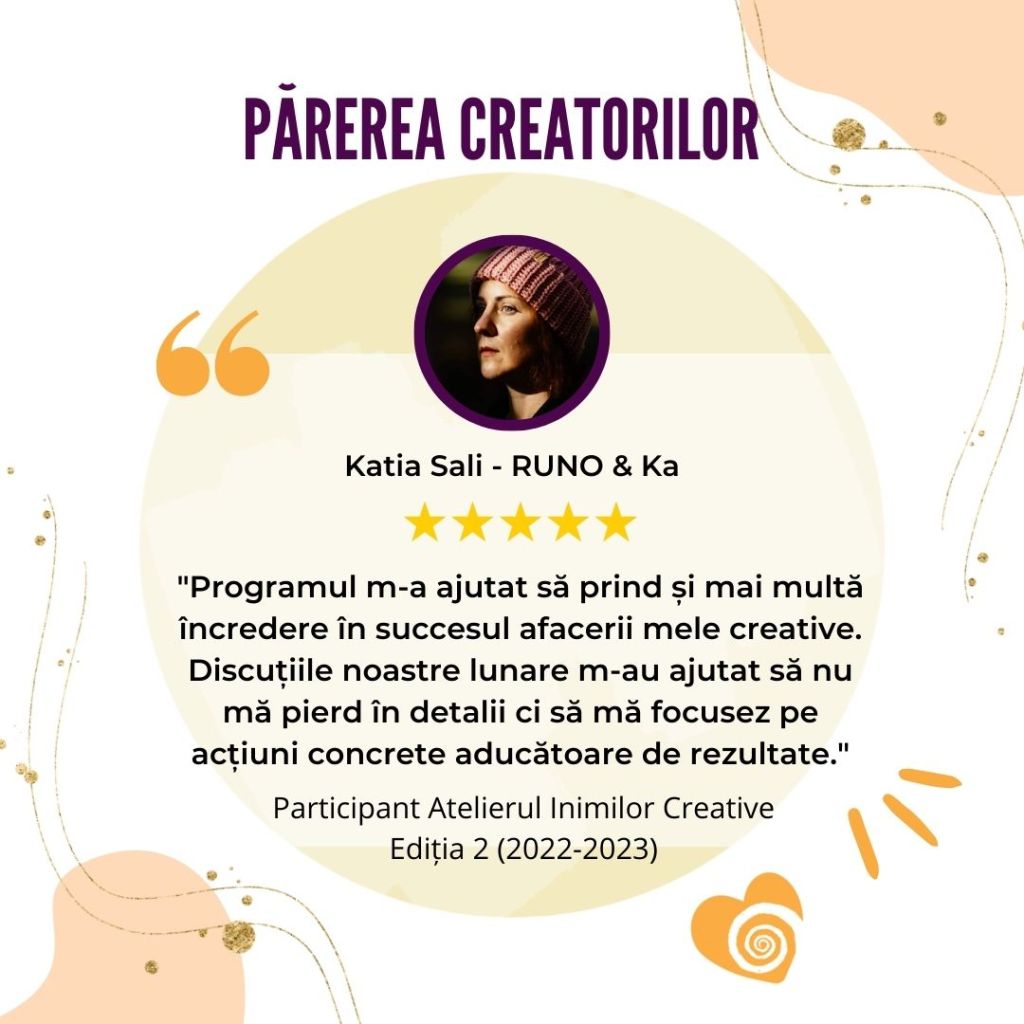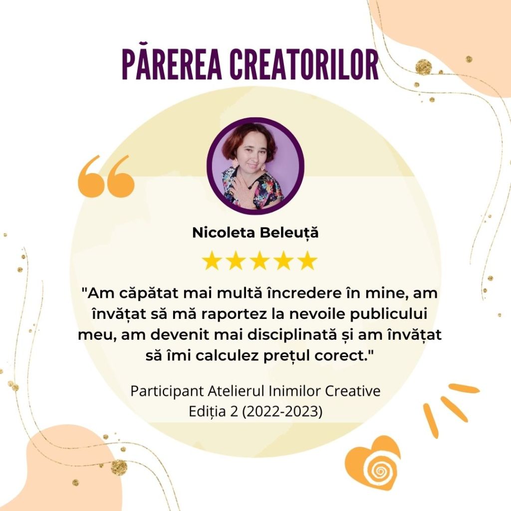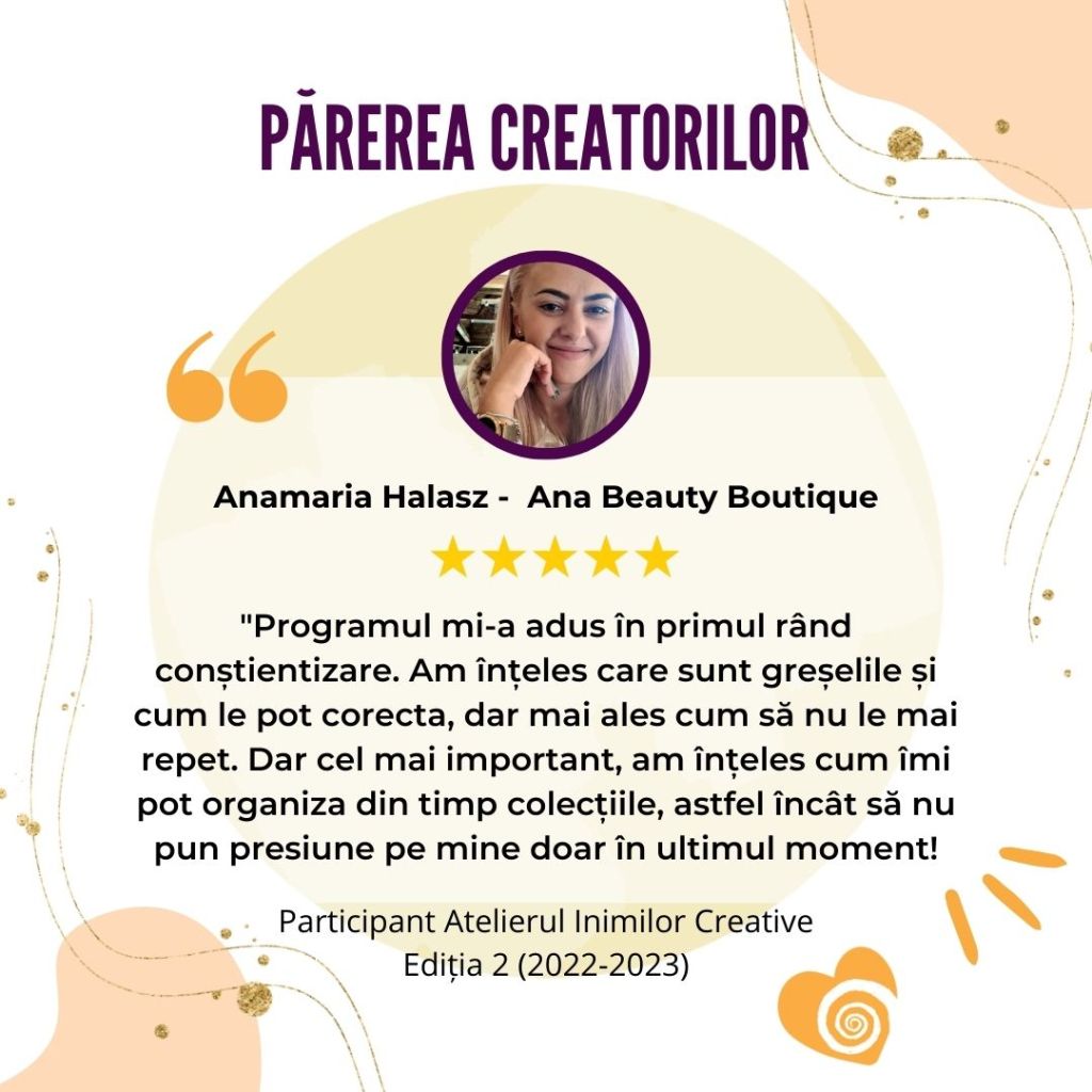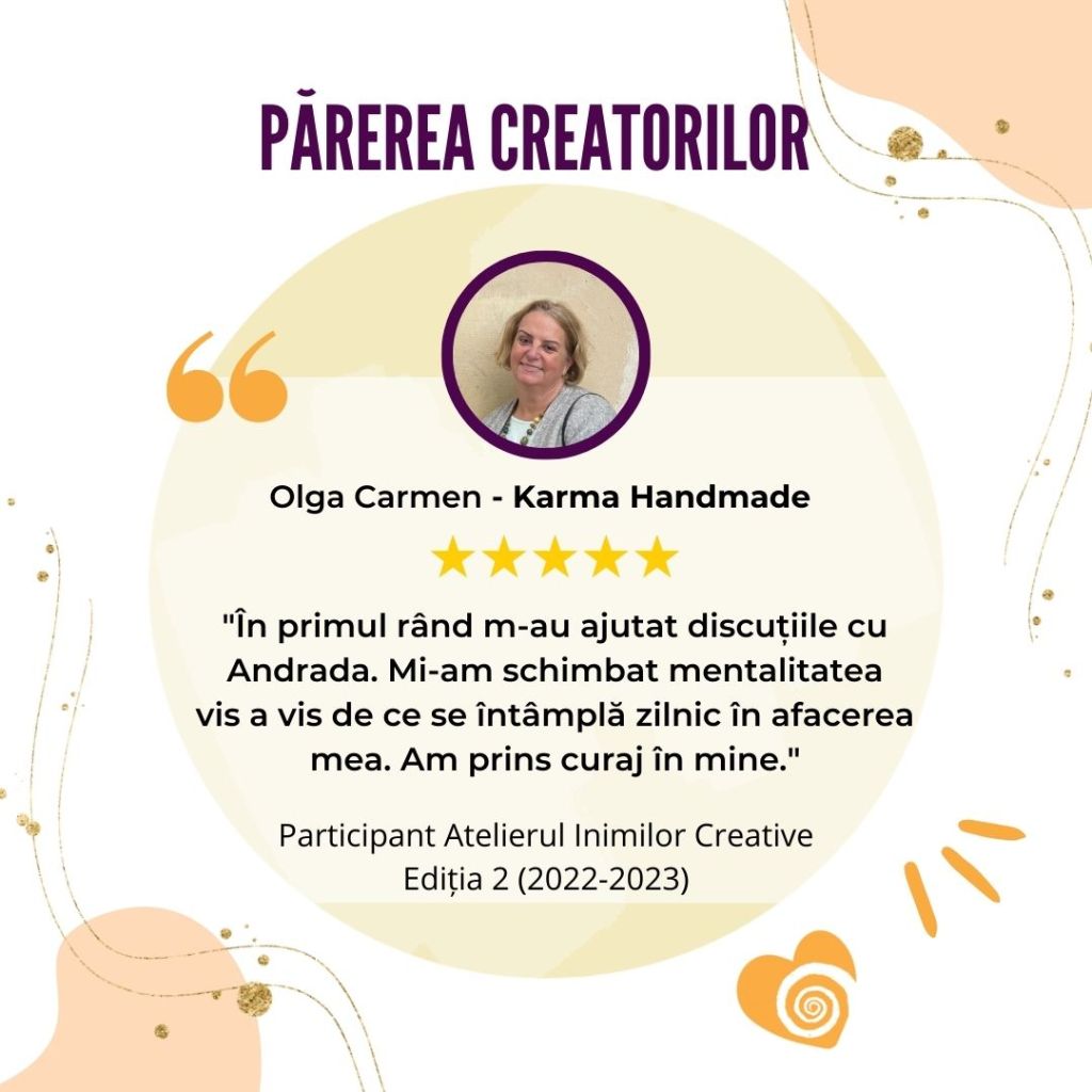 „Afacerea mea creativă s-a născut și a crescut odată cu participarea la Atelierul Inimilor Creative. Mulțumită acestui curs mi-am descoperit misiunea și am reușit o conexiune sinceră și din inimă cu publicul meu țintă.„