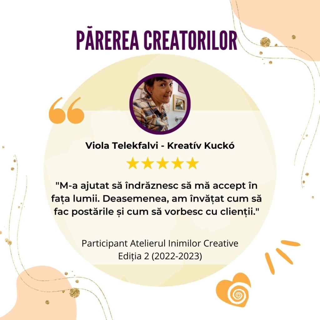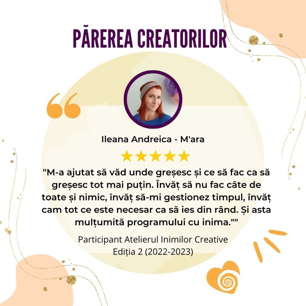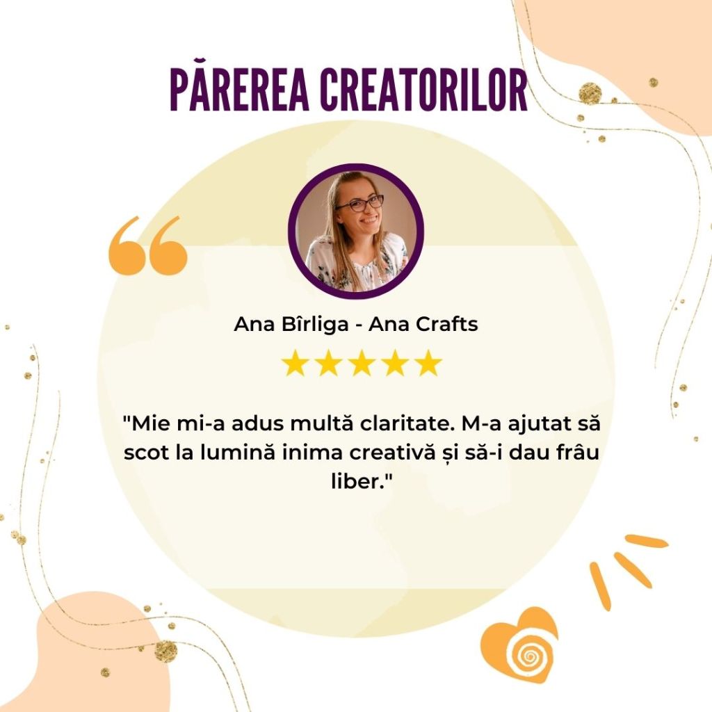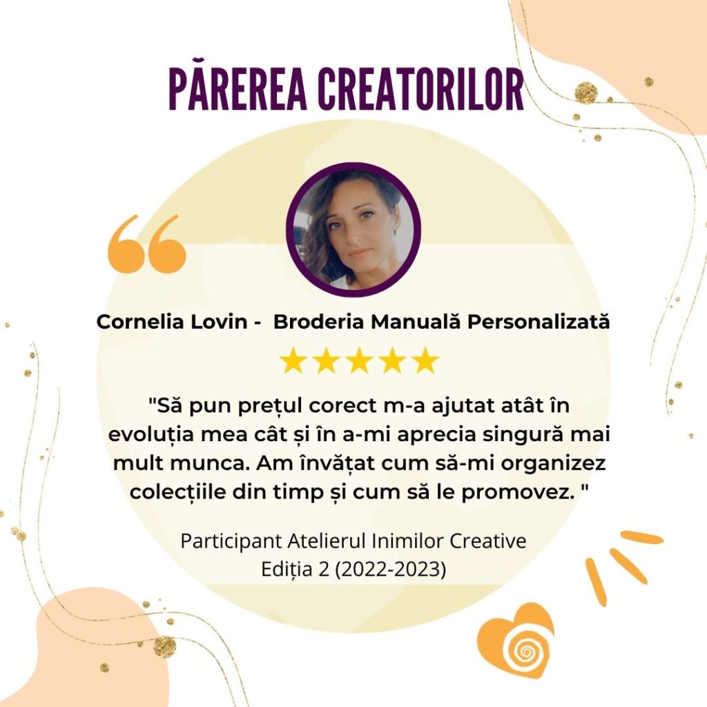„Afacerea mea creativă s-a născut și a crescut odată cu participarea la Atelierul Inimilor Creative. Mulțumită acestui curs mi-am descoperit misiunea și am reușit o conexiune sinceră și din inimă cu publicul meu țintă.„