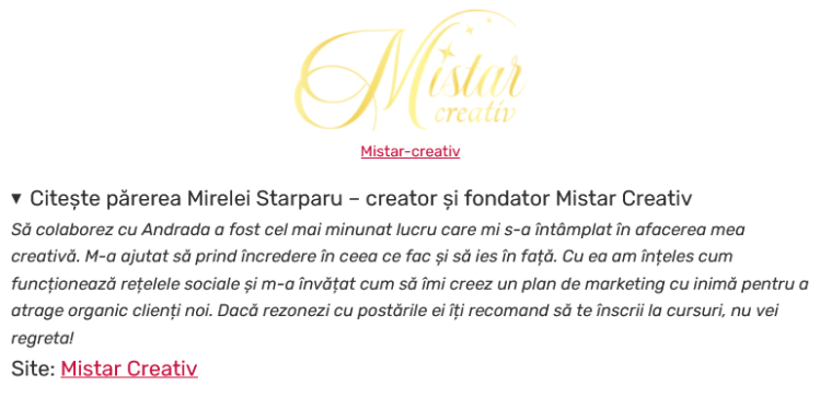 ✔ Te promovezi cu adevărat autentic, fără să te simți ca un vânzător din piață care doar urlă De vânzare aveeem! (Și asta doar prin cele 3 principii simple de Marketing cu Inima pe care ți le arăt, din care înțelegi din prima ce înseamnă să fii autentic și să te promovezi ca și creativ!)