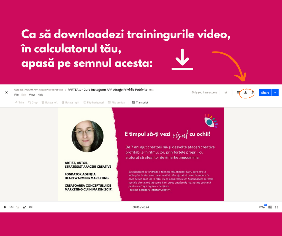 *Atenție! Poți urmări pe telefon, online, doar primele 30 de minute din fiecare parte video a cursului. Descarcă integral cursurile video în calculator/laptop ca să urmărești cursul în tihnă.